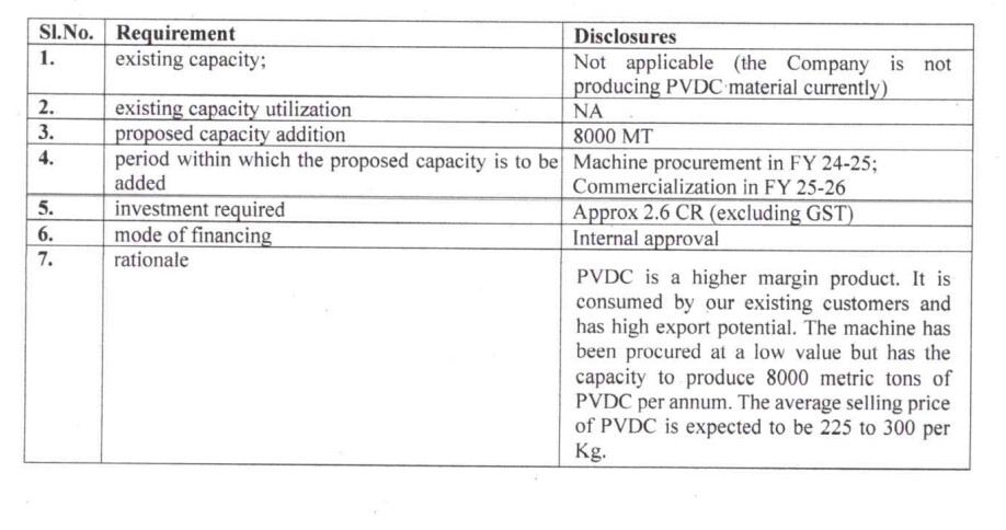 - Delay in PVDC Commercialization, The upcoming 1,000 T/month PVDC line was acquired distressed (from an NCLT asset sale). Any delay in refurbishing or qualifying the asset could push back revenue and margin upside from this vertical.