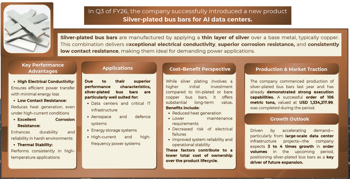 Bhagyanagar India introduced a new product, which is silver-plated busbars for AI data centers in Q3FY26.