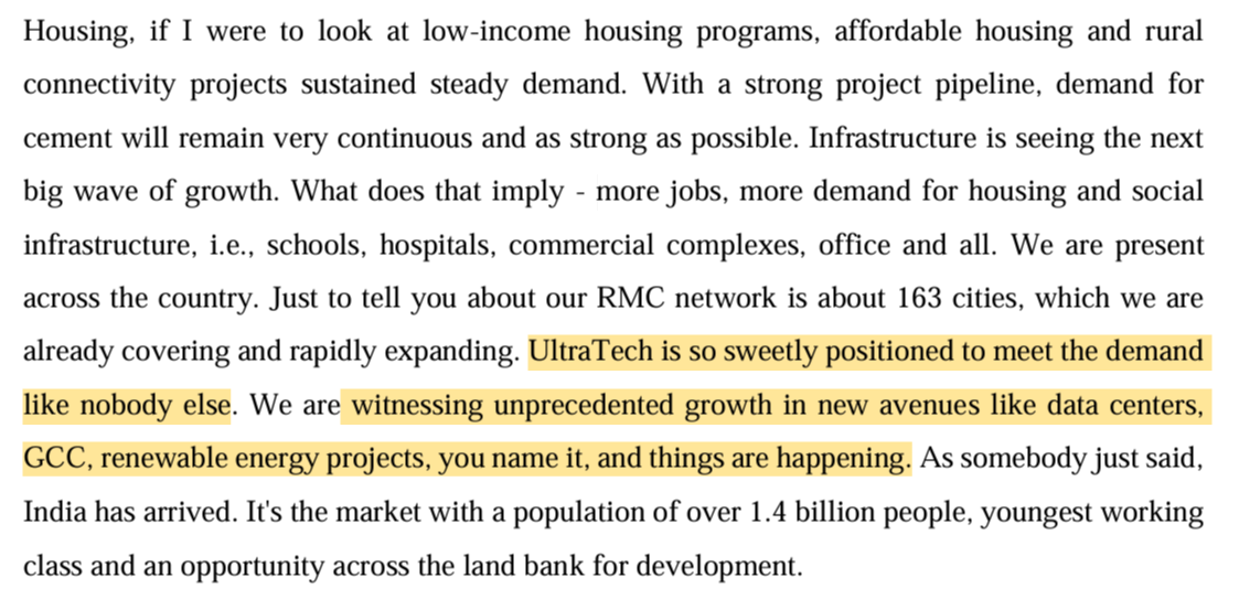 Ultratech Cement said in Q3 Con-Call that they saw Unprecedented Growth in data centers.