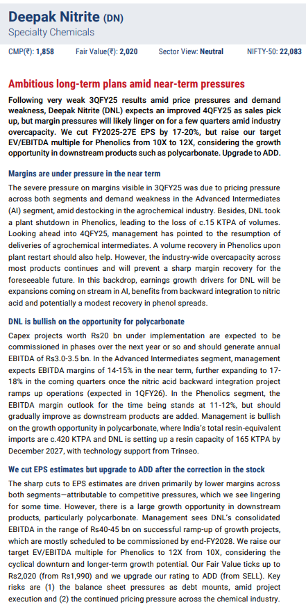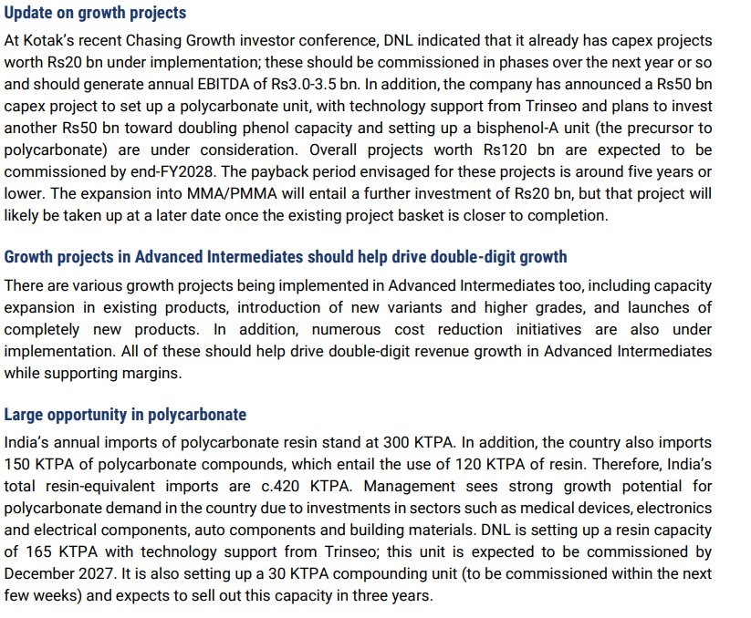 FY27 is inflection year here, Full commissioning of PC Resin + BPA + IPA, Captive nitric acid integration improving cost base. Market is not yet pricing in FY27 optionalities fully