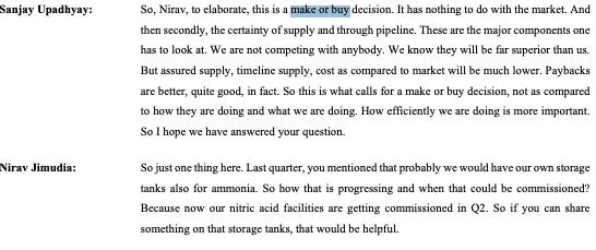 They are focusing on increasing margins by backward integration and import substitution of phenol and acetone, and ramping capex on nitric acid, photochlorination and hydrogenation.