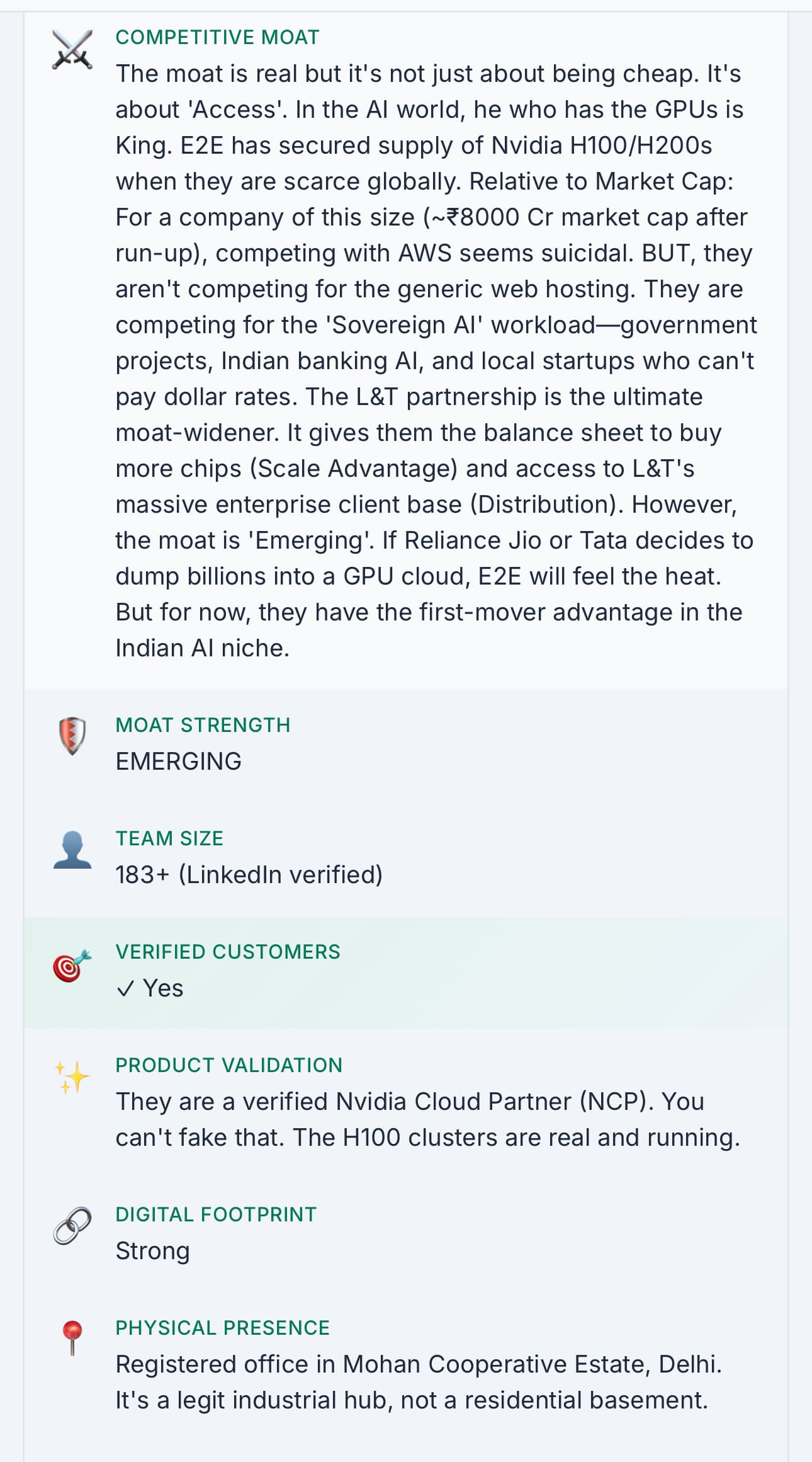 - E2E has right to win, It is not about who has maximum GPUs at arsenal. But now it is all about who can optimally run a AI workload and generate good throughput from GPU clusters and E2E know this, Thanks to amazing support they get directly from Nvidia Team.