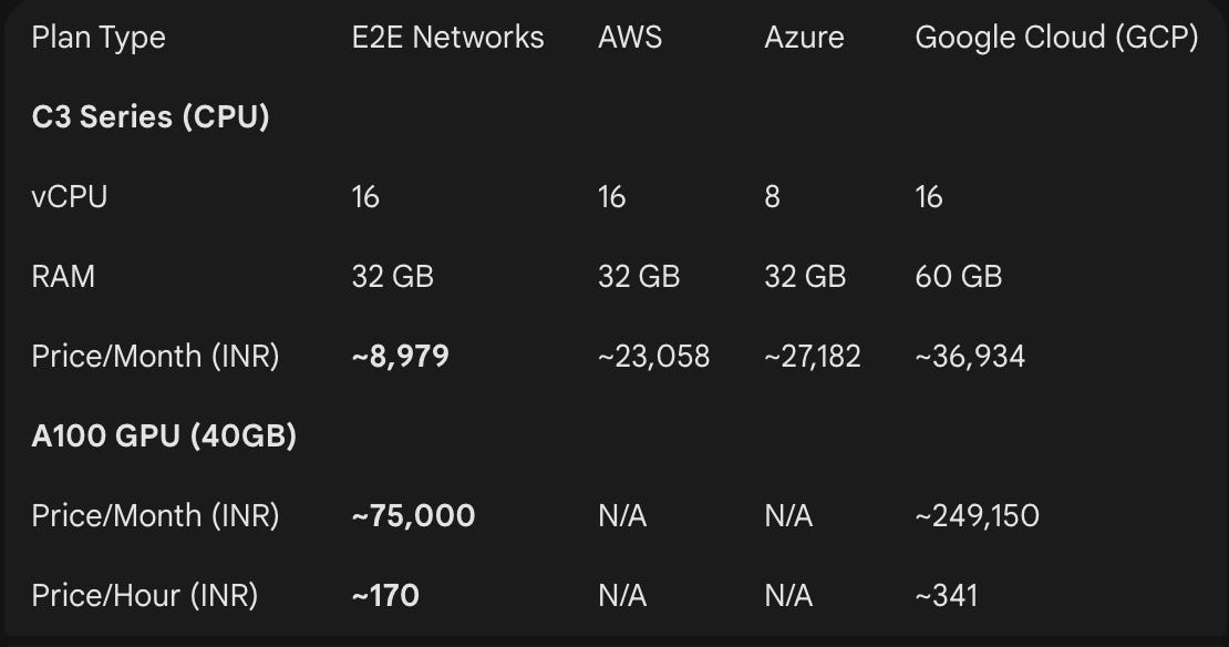 - Potential improvement in cost competitiveness versus hyperscalers like AWS/GCP, aided by currency movements. GCP cost A100 80 GB at $3600 vs E2E costing is $1120 for same machine. (3x+ difference)