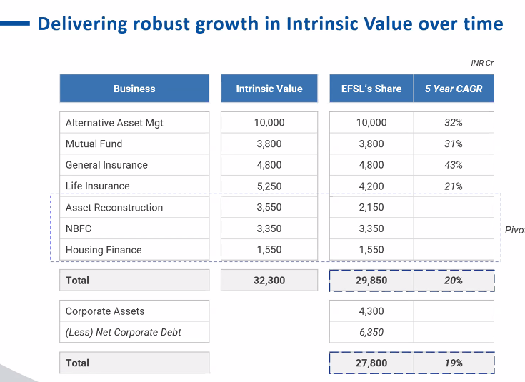Youâre right sir. They have been messing with the intrinsic value quite a few times. But this is my POV - do let me know what you think. Edelweissâs share is 29300cr. Letâs be pessimistic and discount this further by 20%. That gives 23440cr, which is a bit more than double the market cap.
