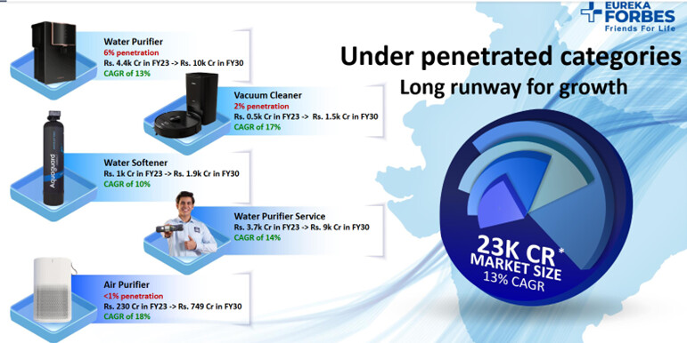 Eureka Forbes is an Indian consumer durables company selling water purifiers, vacuum cleaners, and air purifiers. They are market leaders in water purifiers (Aquaguard brand, 45% market share) and vacuum cleaners (Forbes and Euroclean brands, 60% market share).