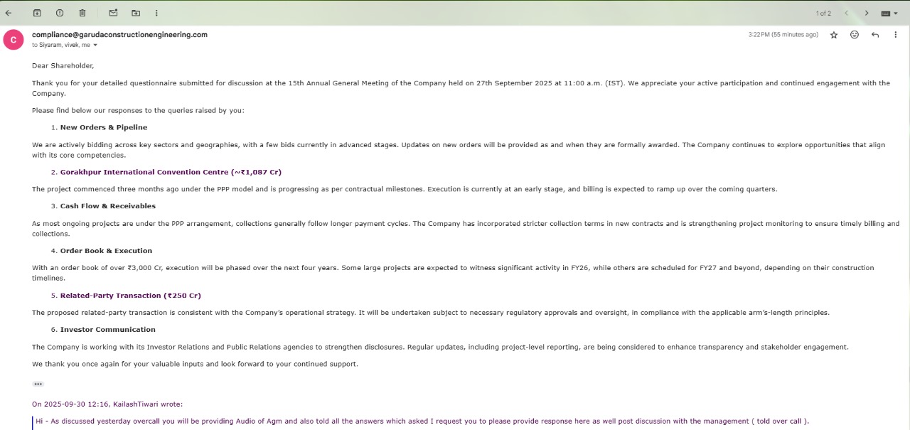 (It is worth noting that Mr. Utpal Sheth, both personally and through Trust Mutual Fund, has made a substantial investment in Garuda since its IPO, subsequently increasing his stake via the open market. It is possible that a thorough level of due diligence was carried out by him.)
