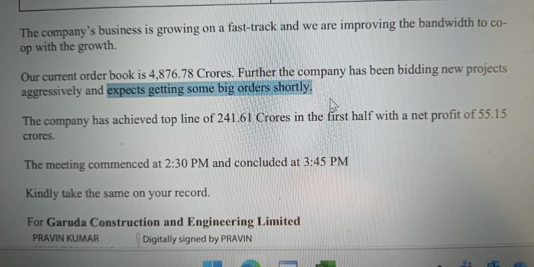 In the interview, MD Praveen Agarwal projected a strong outlook for Garuda Construction & Engineering.