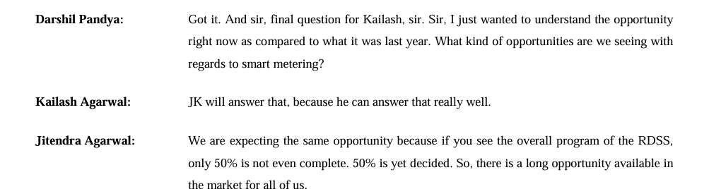 I am sure that total installed smart meters and smart meters where tenders are already awarded would constitute for more than 50% of the total energy meters in India. Smarts meters would majorly be in Tier1 & Tier 2 cities only. We would have Tier3, Tier 4 & Rural area’s yet to be covered with smart meters.