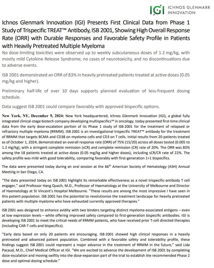Ichnos Glenmark Innovation (IGI) Presents First Clinical Data from Phase 1 Study of Trispecific TREATâą Antibody, ISB 2001, Showing High Overall Response Rate (ORR) with Durable Responses and Favorable Safety Profile in Patients with Heavily Pretreated Multiple Myeloma