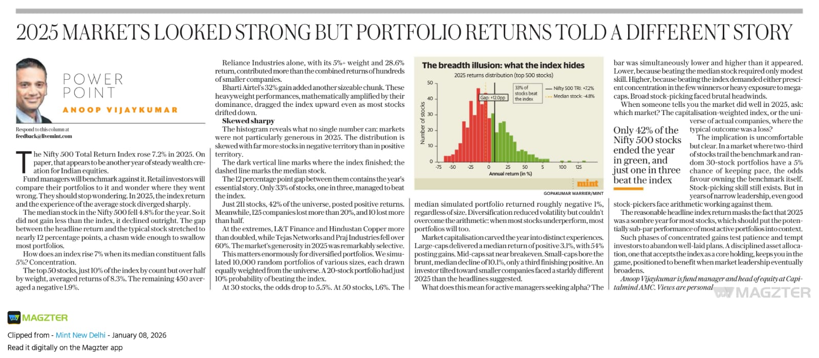 This article in today’s Mint highlights the concentrated nature of the rally, where while Nifty 500 TRI rose by 7.2%, the median stock fell by 4.8%.