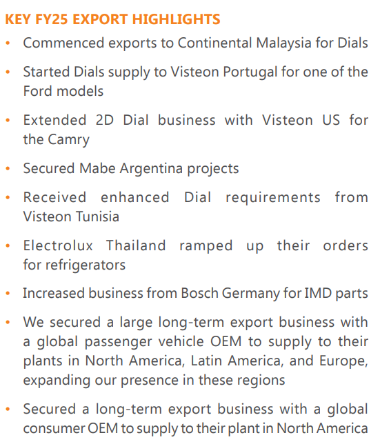 Now the management is very upbeat on exports and optical lens oppurtinity as it is a high value thing and this will increase the kit value significantly and every car has a screen now.plus they entered into an agreement with BOE Varitronix to help them in tech know how for this.Exports have been a main goal for them which reflects in their new order wins as well because of cost arbitrage.
