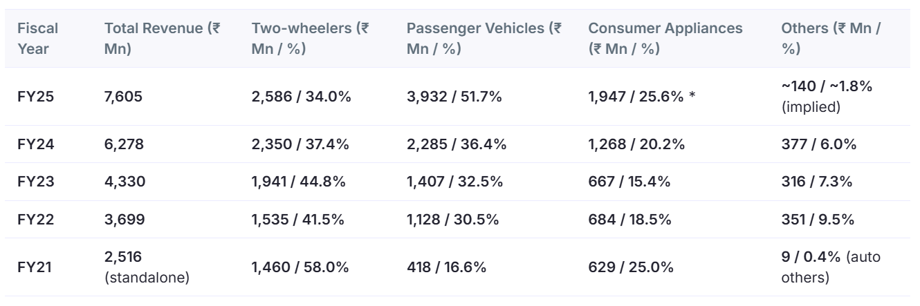 So basically the passenger vehicle revenue grew very good 41 crore to 393 crore and their consumer appliance division grew from 62 crores to 194 crore.these growth rates are mainly driven by acquisitions.in my view they have excuted very good on inorganic acquisition part and also the fundamental reason for acquistion is they were previously highly dependent on two wheelers in fy21 which contributed to 58 percent and in two wheelers what you see is what you get there are no high value aesthetic parts and thats why they targeted companies which can help them grow the pv,consumer division and in last five years we can see how they have grew in these divisions.PV is the area where the major growth in future can come from as that is where aesthetics have upside .