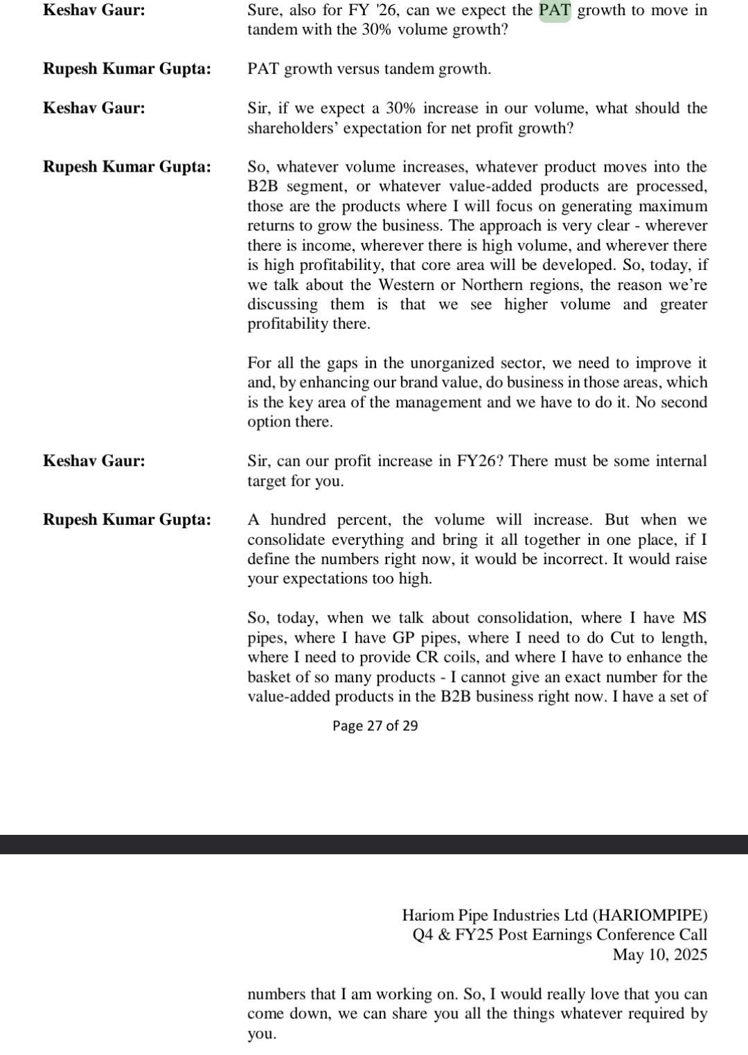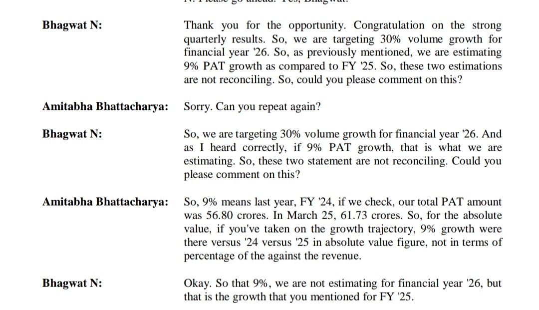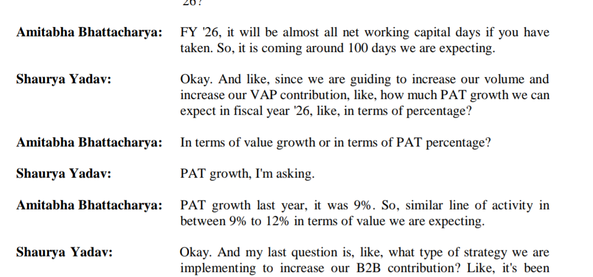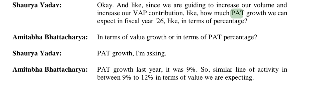 I still don’t understand what are they guiding for volume growth, revenue growth and pat growth for FY27?
