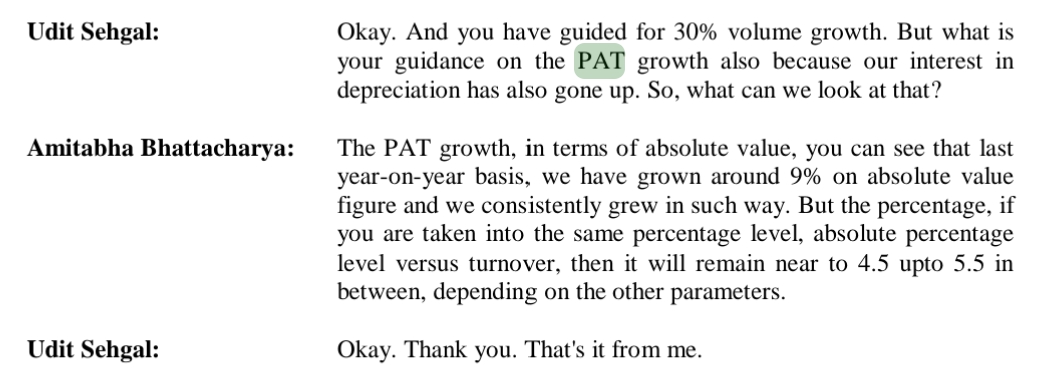 Why are they projecting 9-12% of PAT growth eventhough targeting 30% volume growth? I have gone through concall, the answer I couldn’t understand..