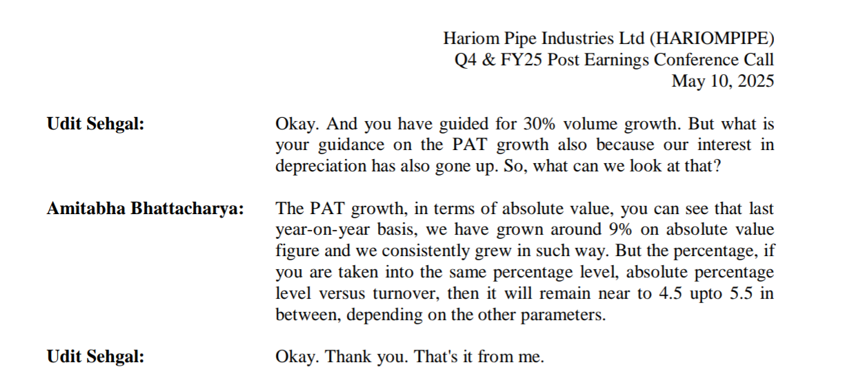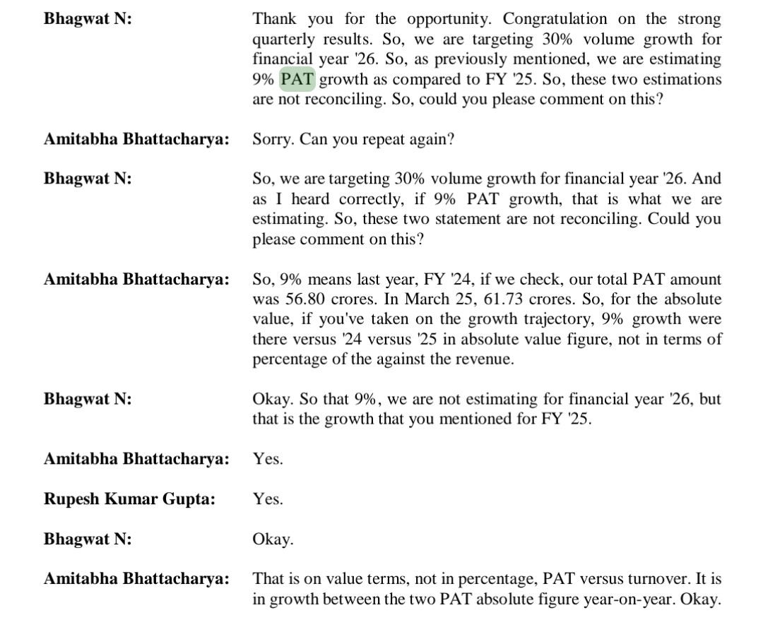 In one answer they mentioned that PAT margin was around 4.5% in Fy25, and that future margin will remain 4.5-5.5% range.