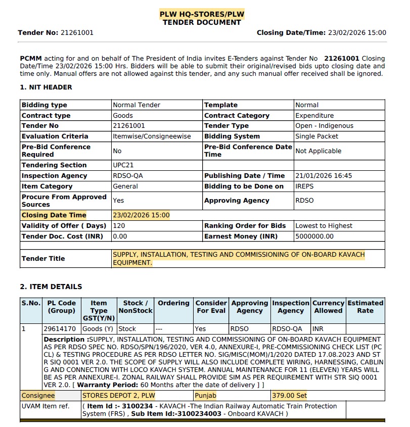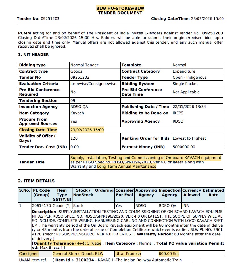 Kavach TAM update: Two new tenders floated by Railways (BLW & PLW)