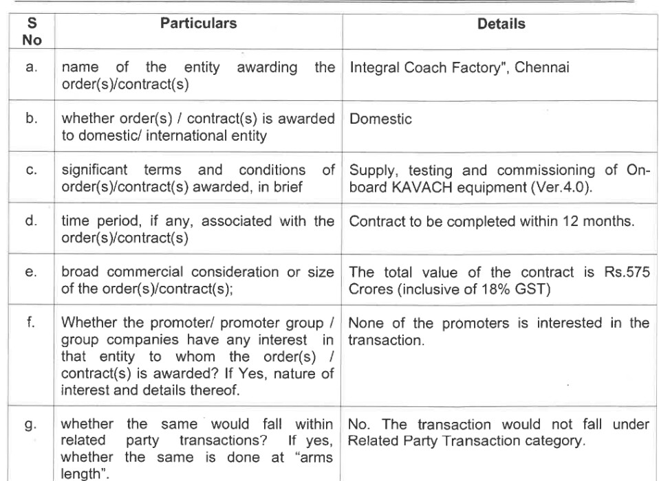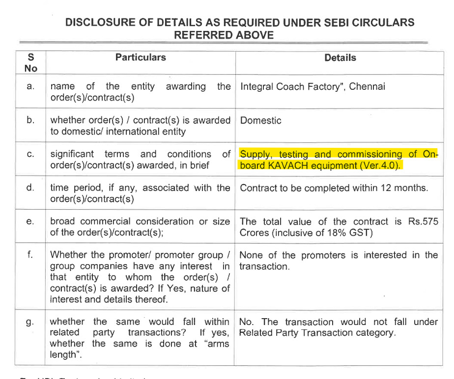 HBL got ICF, Chennai order of 575 crores (Incl GST) for Kavach 4.0 supply & commissioning.