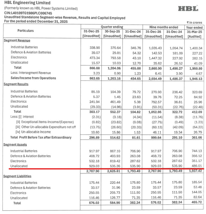 One observation regarding Dec results. HBL releases segment wise revenue, results and capital employed. Saw a sharp rise is assets under the category âUnallocatedâ by 400 Cr (almost 75% over the Sepâ25 quarter and 100% increase over Marâ25 quarter).