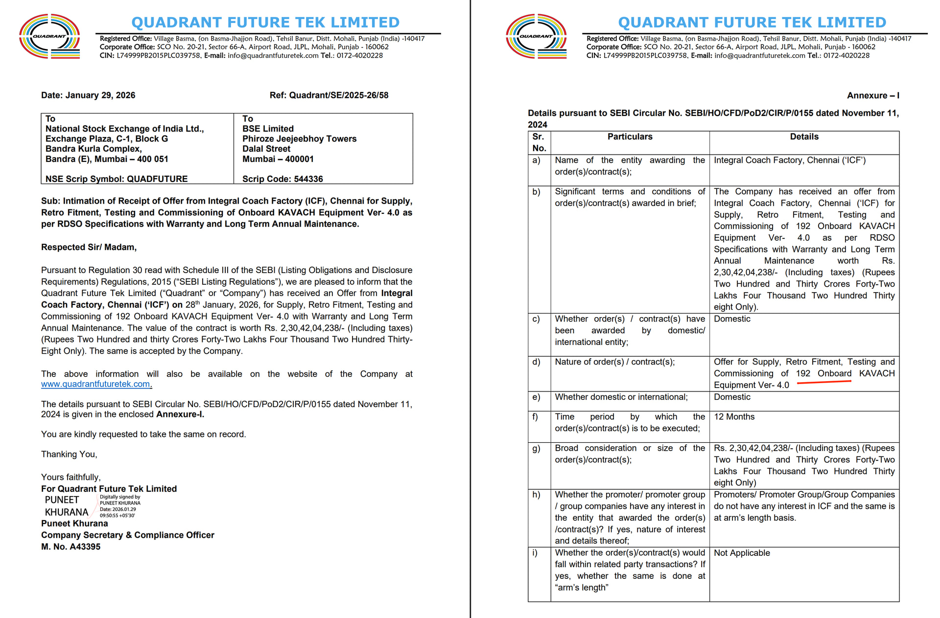 Quadrant gets ICF order but at very high rate of 1.2 Crore per unit.