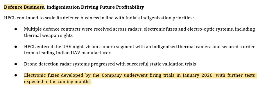 Channel information indicates that previously in 2025, HBL has supplied electronic fuzes for 40mm grenades to CRPF and 155mm electronic fuzes to a European country, both via MIL. Taken together the revenue from these 2 supplies could be around 10% of FY25 revenue. While not very significant, this would mean that HBLâs investment and patience has finally started paying off. Bigger things might be in store in FY27 and FY28.