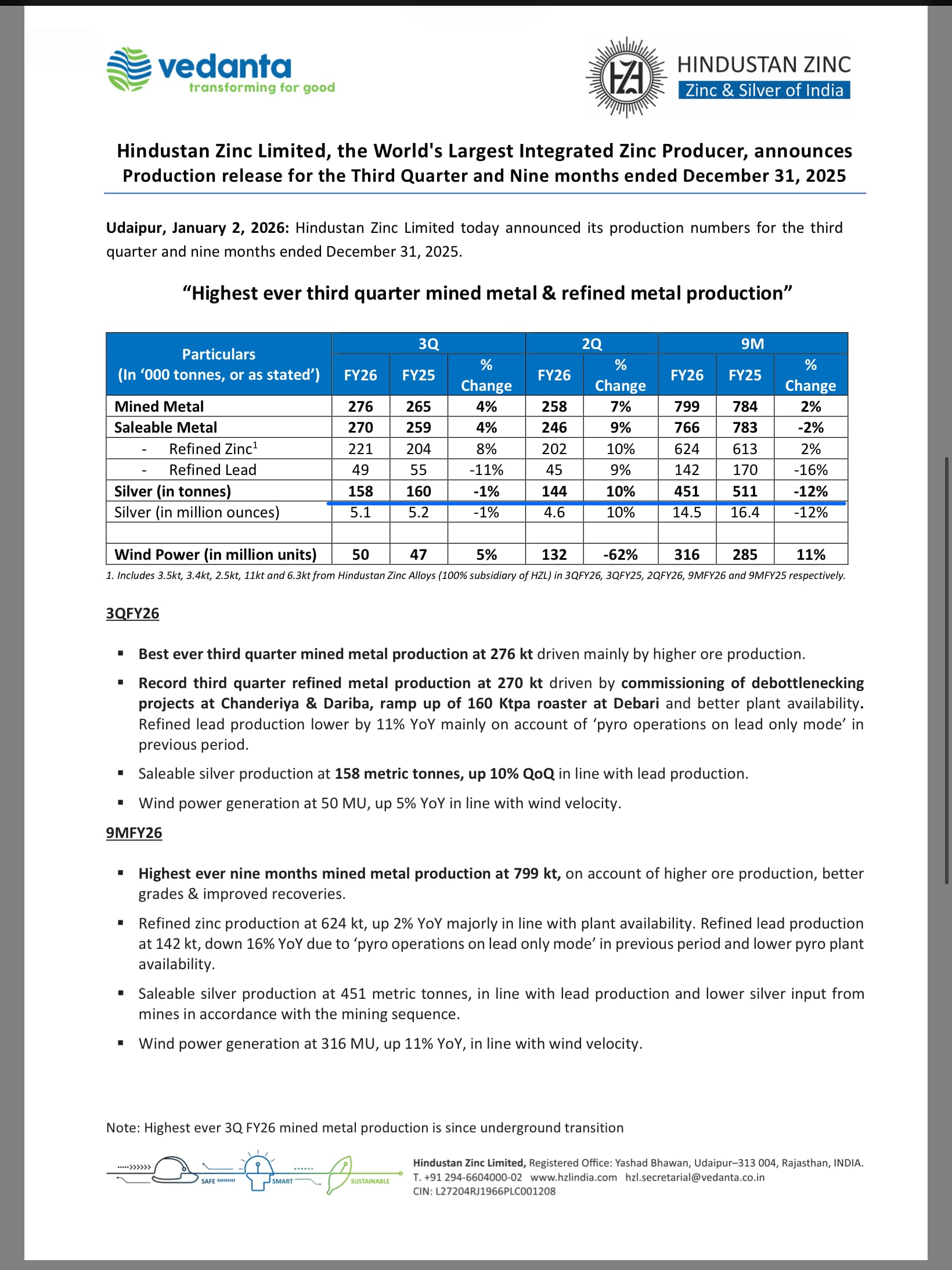Zinc smelting capacity @ .913 MMT + .16 MMT ( recently commissioned @ Derbari ) + .21 MMT ( recently commissioned @ Chanderia )