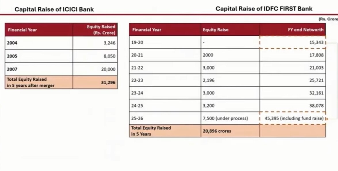 ICICI Bank raised ₹31,296 crore in capital between 2004 and 2007, while IDFC has raised around ₹20,800 crore between 2016 and 2024. To build a strong bank, capital needs to be raised from time to time — because a bank needs funds both for growth and to write off old legacy loans.