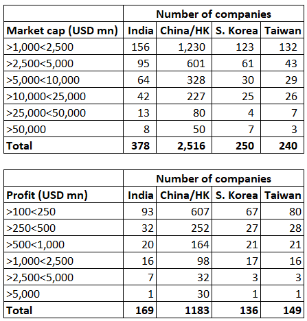 I ran a screener (thanks to Tikr) to compare the universe of listed stocks in India, China/ HK, South Korea and Taiwan. This is just for educational purposes and the summary is as below. Copying the link for a blog I have created as I am unable to copy tables here.