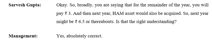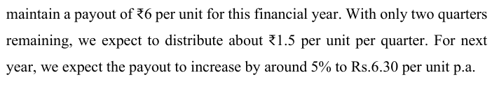 Can you please share the link of the concall as I am not able to find it. Also is the 6.5 rs is for the entire year which is reduction of payment of current 8rs per year. I thought the 1.5 rs quarter is only for Q2 & Q3 of this year as the assets have been acquired in the mid of the quarter. If its 6.5 per year then the yield will be very low at 10.6 % year. Thanks for your answer.