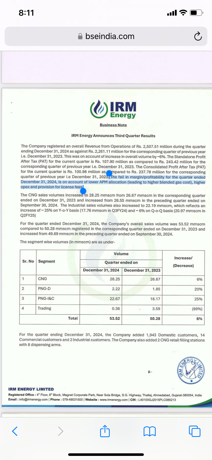 What i understand sir - increase of sales not an issue most probably in coming 2-3 years they can easily increase sales by 50%-60% or even much much more, what i am not able to get hold on is margins profile, definitely this Quarter margin one of the lowest both due to reduction in apm & sourcing of high natural gas prices internationally , meanwhile from april internationally natural gas prices have decreased around 20% which can reflect in IRM next Quarter results(will it? Bcos i don’t know there procurement process, how many days before it is) but what about sustainable margins ? Bcos natural gas commodity in itself has been very volatile and definitely in 2024 it has increased a lot so can it be Around 8-9% margin profile or higher, definitely if environment will allow they have an option to increase selling price , but don’t think it can happen so early , coming to valuation if we take price to book metric then it’s cheap in comparison to other players ,also in terms of operating cash flow to price that is also okay when situationally cash flow will increase in coming years,