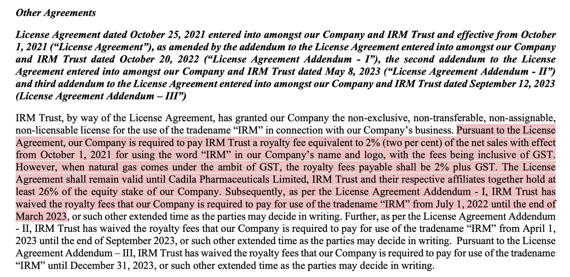 I have a question. Wasn’t the royalty fee disclosed by the company in the RHP? Please see the screenshot below from Page 238 of the RHP. The company disclosed that a royalty fee of 2% of revenues would have to be paid till the time the promoters hold 26% equity stake. It also mentioned that fee had been waived till end of September 2023. And they seem to have actually acted as per this disclosure. What am I missing?