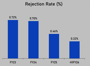 • 40% YoY growth in volumes and 43% YoY growth in revenue in H1 FY26