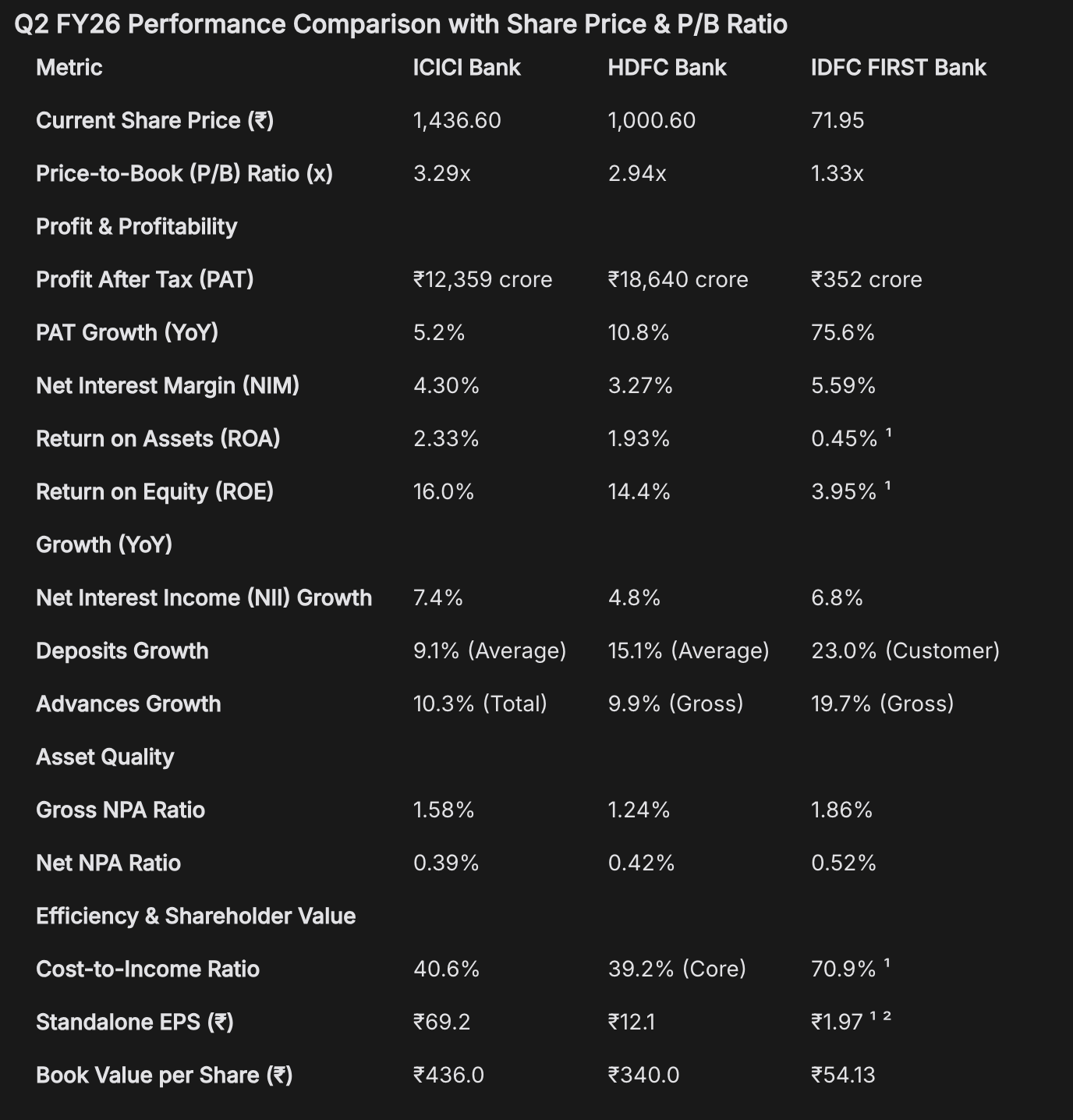 ICICI Q2 Review and comparison with HDFC and another smaller player IDFC First