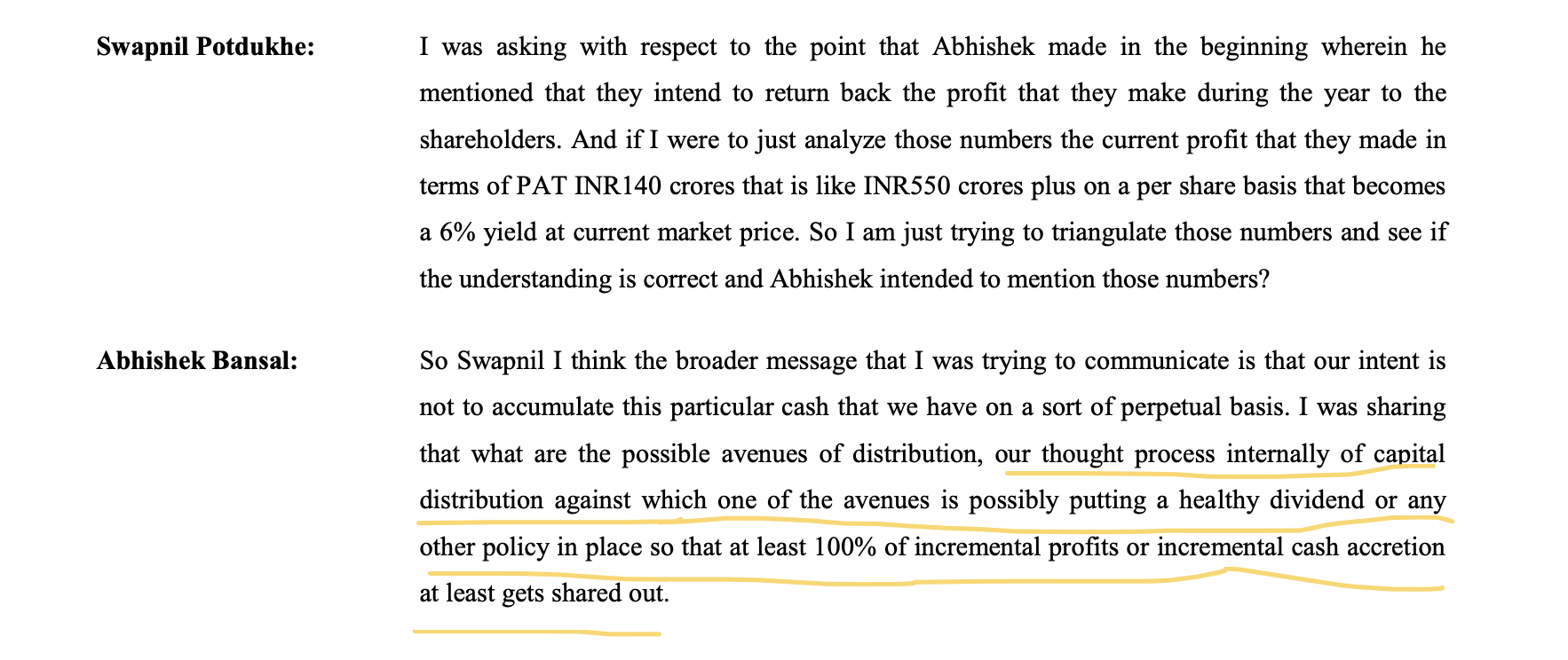 Regarding the dividend policy, there is no formal announcement by the company. In the past the management has indicated that they will return atleast the full year profit (currently translates to ~8+% yield). Below is the screenshot of the transcript in July 2024.