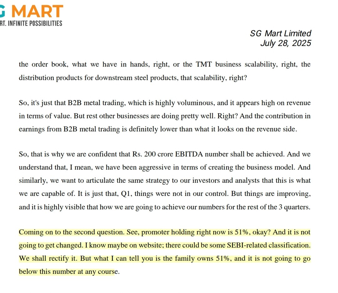 Coming to SHP of SG Mart: The Promoter Group Holding is 36% in Q1 26 SHP and no doubt it has been on a regular decrease. However if include the shares help by gupta family in the public section, the holding is above 50% and it has been committed by management that it won’t go beyond 50% (screenshot from CC attached)