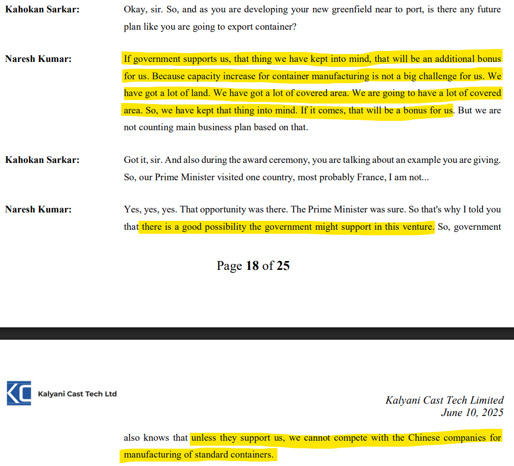 - Domestic Market Advantage: Management notes that import of containers for domestic requirements has been negligible since 2021. This situation benefits domestic manufacturers like Kalyani Cast-Tech, allowing them to capture a larger share of the growing Indian market.