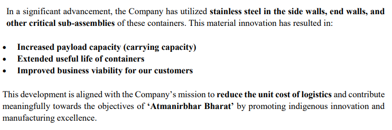- Strategic Alignment and Recognition: The company’s innovative efforts in designing and developing special containers to reduce unit cost of transportation are aligned with the government’s focus on reducing logistics costs. Their plant was visited by the Minister for Railways, Mr. Ashwini Vaishnaw, along with 150 railway officers, to appreciate their innovative ideas. The company positions itself as a “true ambassador of Make in India initiative” and contributes to “import substitution”.