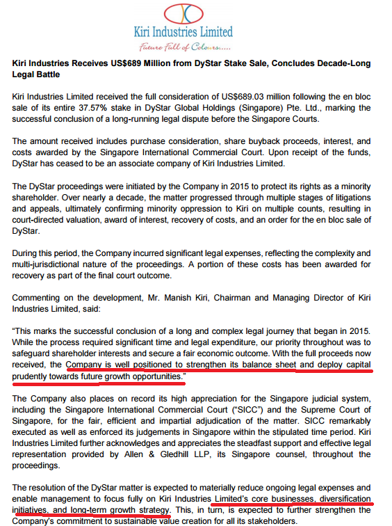 Latest press release from Kiri uploaded after market hours. It doesn’t even mention “rewarding shareholders” anywhere. It’s ironic that the case was fought to protect rights of minority shareholders. It seems, more than 90%+ fund to be deployed in new growth areas doesn’t necessarily mean dividend to account for ~10% proceeds. It may be much lower.