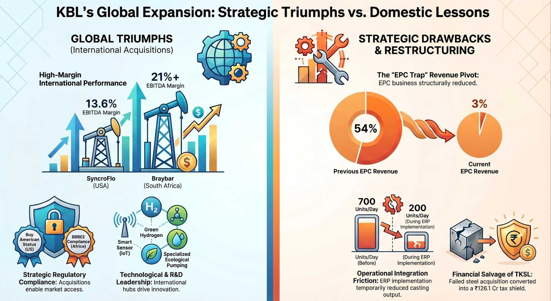 KBL’s acquisition strategy is a tale of two halves. Its international acquisitions (SPP, SyncroFlo, Rodelta) have been brilliant strategic manoeuvres, providing geographic moats, regulatory compliance, and access to premium global margins. Conversely, its historical domestic acquisitions (TKSL, Aban) were strategic missteps that tied up capital and required years of painful unwinding and restructuring to fix. Today, the clean balance sheet indicates that the company has successfully digested these historical drawbacks.