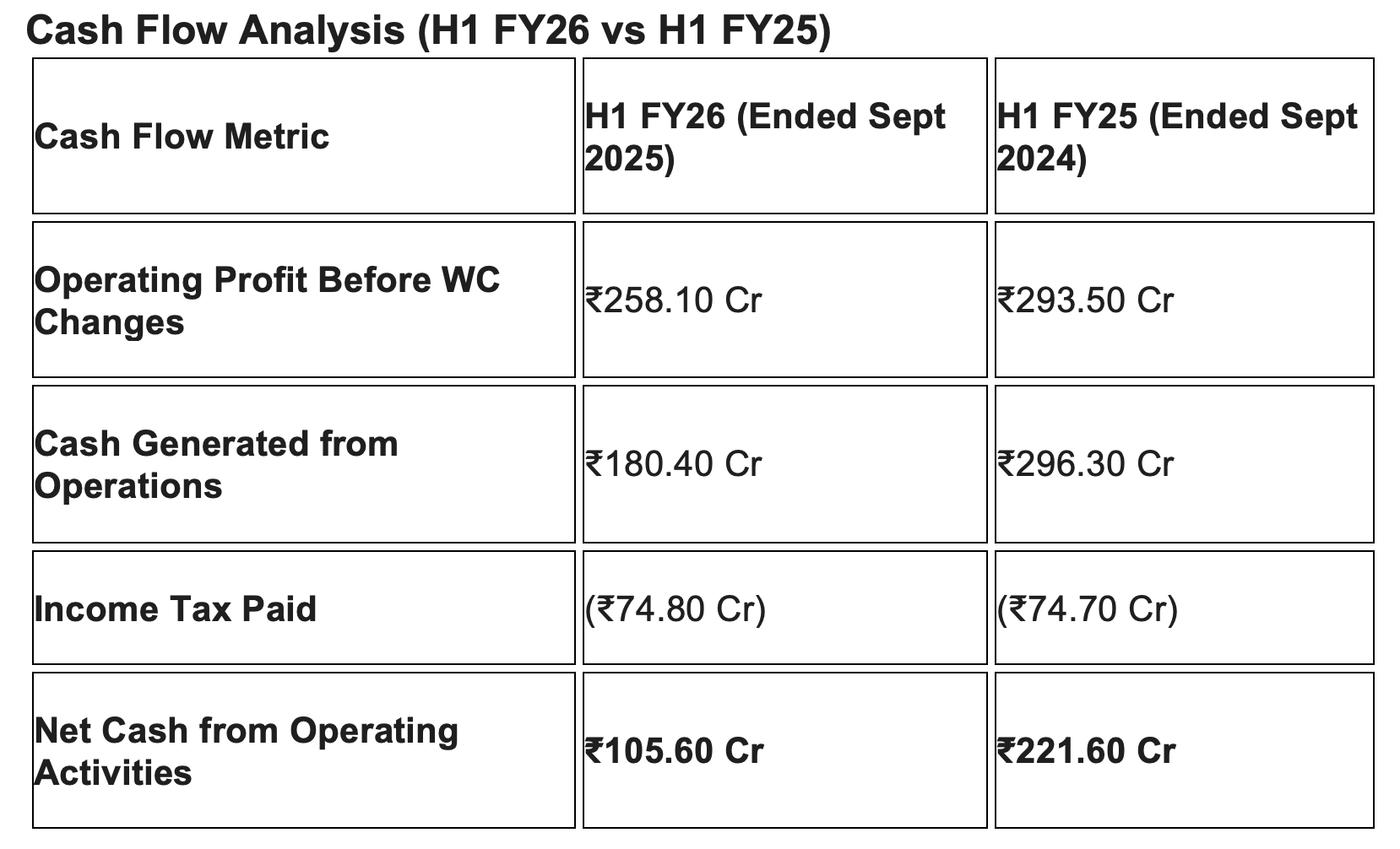 Operating Cash Flow (OCF) Moderation: Net Cash from Operating Activities dipped to ₹105.60 Crores in the first half of FY26, compared to a stronger ₹221.60 Crores in the same period last year.