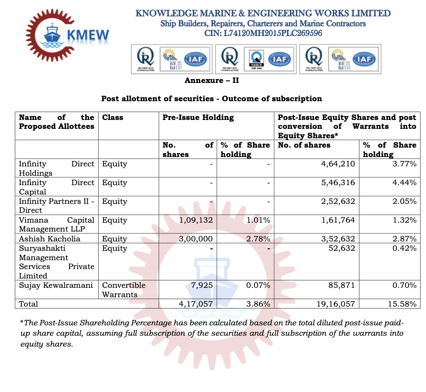 Expect most companies in the sector to do well considering this a strategic priority for the government. China, Japan & Korea control 90% of the ship manufacturing in the world. The way rare earth metals made us dependent on China, similar scenario can play out in future if we are not ready. KMEW has shifted gears from being a pureplay dredging company to ship building & other port services to private and government players. The order wins that we see will not play out quarter wise as these are long term contracts. If you see the contract wise details, some of them go into execution next year. We need to track performance YOY. Considering the huge runaway ahead, my guess is that a lot of smart money from institutions/MFs/HNIs is entering the counter even in a market which continuously giving headaches