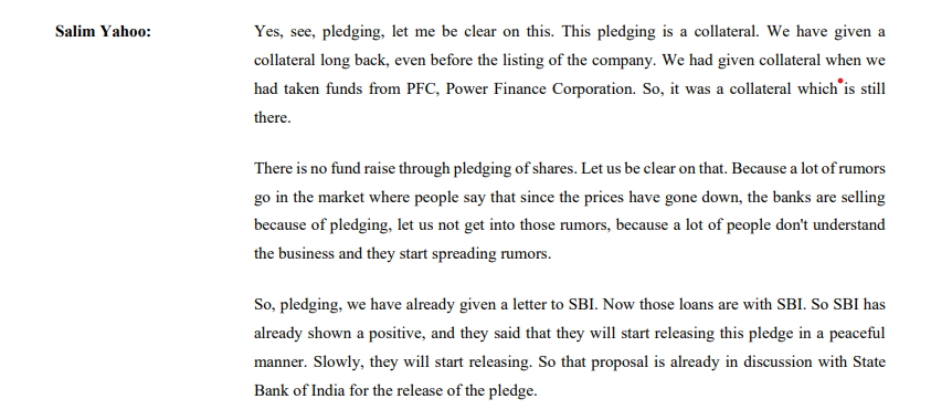 Managementâs response on pledge, though itâs not clear why they its a collateral but not for fund raise. Anyways, a key aspect to monitor, if they will be reducing it. Their borrowing has come down significantly, and so is the interest they are paying.