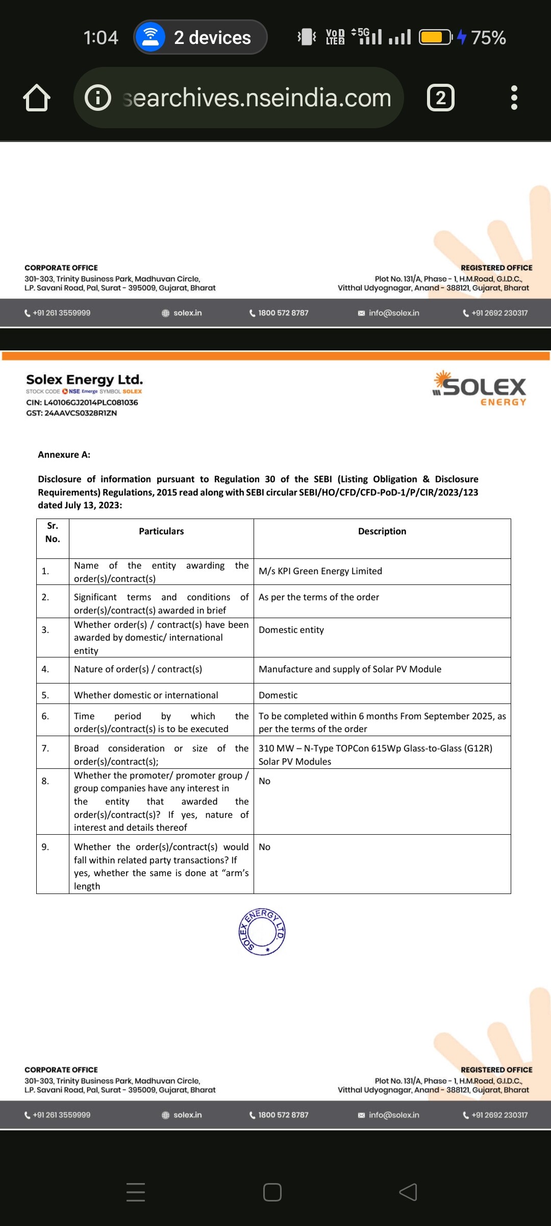 - LOI from GUVNL for 150 MW wind project, strengthening hybrid pipeline.