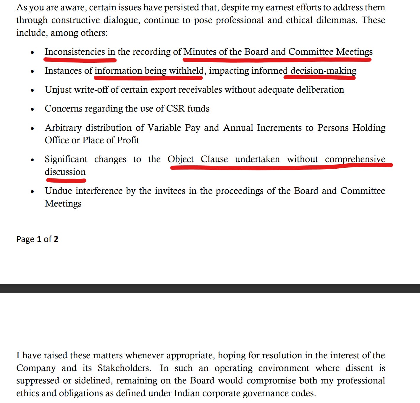 An independent director resigned on September 8. The company disclosed the resignation letter to stock exchanges on September 13—a gap of five days. The letter dropped like a bomb. It cited multiple concerns: inconsistencies in board minutes, information being withheld, unjust write-offs, and an environment where “dissent is suppressed or sidelined.”