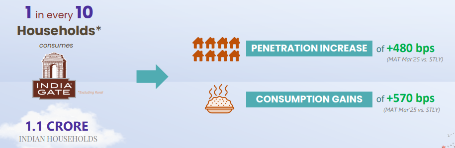India Gate has consolidated its position in Indian homes. Now 1 out of 10 urban homes (approximately 1.1 crore families) uses India Gate rice. In the last year (MAT Mar '25 vs. previous year), the brand recorded a penetration gain of +480 bps, i.e., more households began purchasing it, and consumption gains of +570 bps, i.e., increased purchase frequency or quantity among the existing consumers. Cumulatively, both represent broader adoption and greater consumption, further establishing India Gate’s robust market presence.
