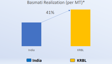 KRBL’s pricing strength in the world basmati market, wherein its realisation per metric tonne through exports is 41% more than India’s average. Such premium is high and indicates the popularity of its market leader brand India Gate and the success of the company in differentiating on the back of its better product quality, brand reputation, and consistent premium positioning, thus allowing KRBL to charge better margins than peers.