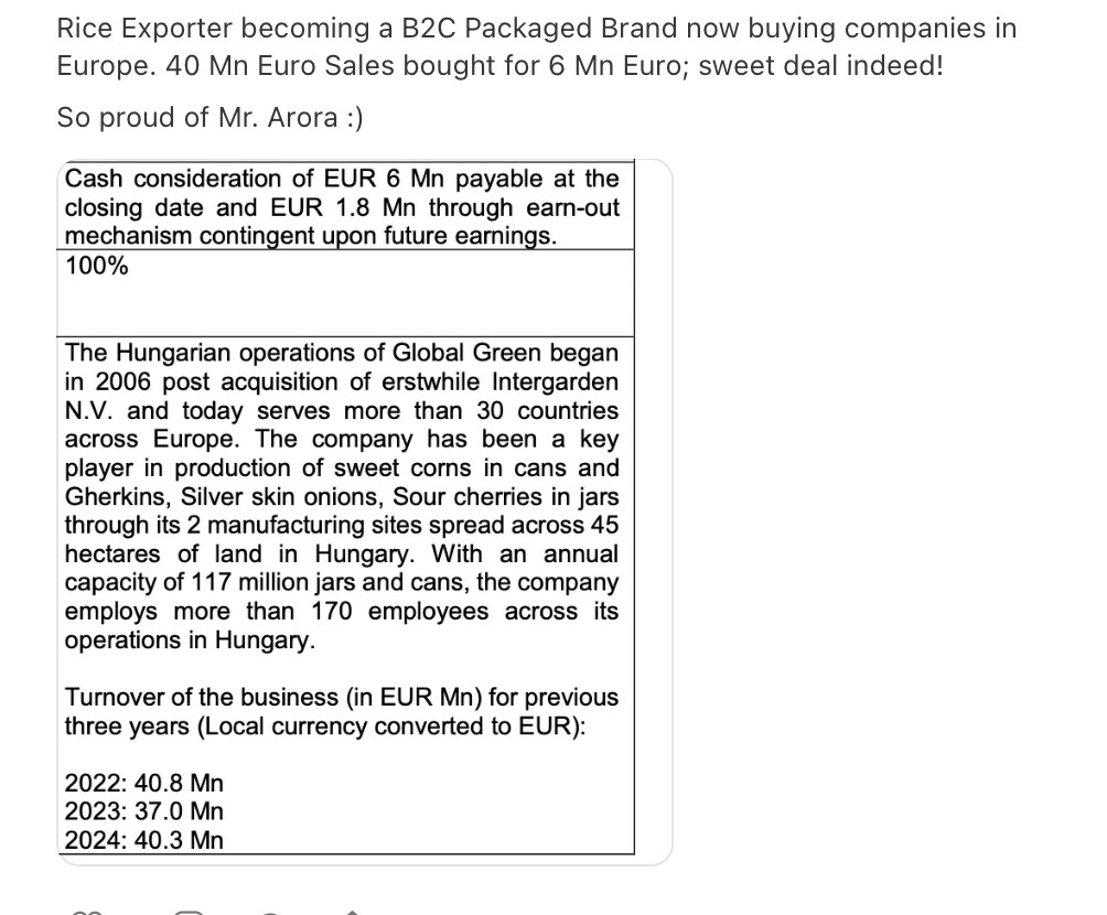 | Diversification | Entry into € 15 billion European shelf-stable fruits & vegetables market | Reduces dependence on basmati rice (~80% of revenues); adds a defensible second food vertical. |