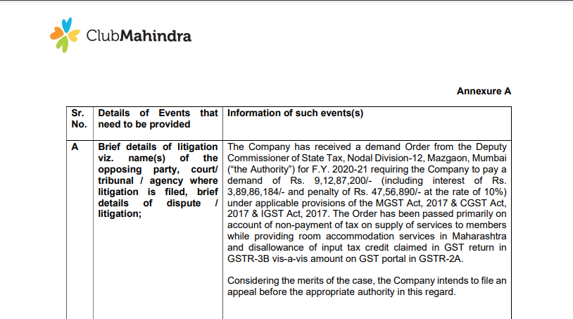 Company has received a GST demand order for ₹9.13 crore from the Deputy Commissioner of State Tax, Mumbai for FY 2020-21.