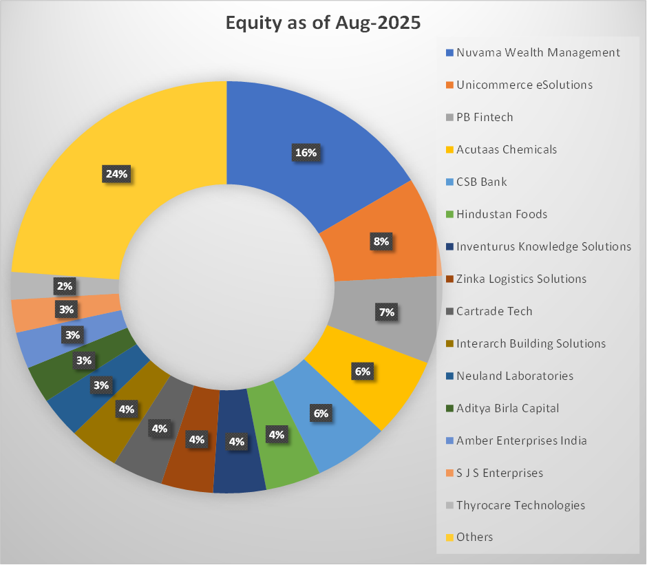 For the first time in last 2-years equity allocation crossed 60%, a jump from 49% in May -2024. Rise in equity allocation is reflection of portfolio performance in last 15 months and deployment of cash/REIT money to equity in dips.