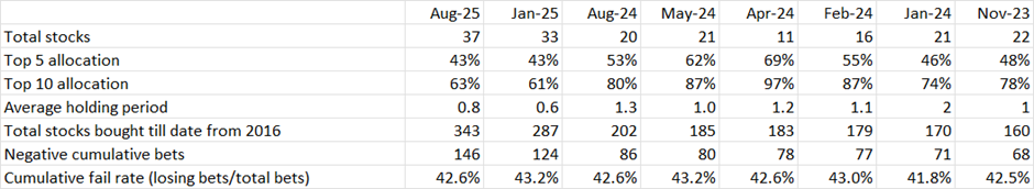 For 8 years (2016 to Mid of 2024) my cumulative buys were 185 stocks, however, in last 15 months (June-2024 to Aug-2025), I have bought 168 stocks. Insane activity.