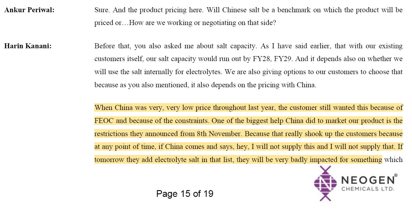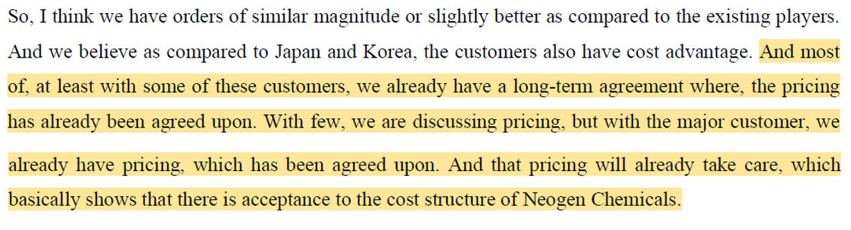 Pricing Locked-in: For electrolyte salts, the company has already signed long-term contracts with major customers where pricing has been agreed upon, signaling acceptance of their cost structure.